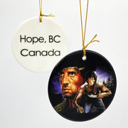 2.75" round ornament with Rambo design on front and Hope, BC on back. Ceramic with gold hanging cord.