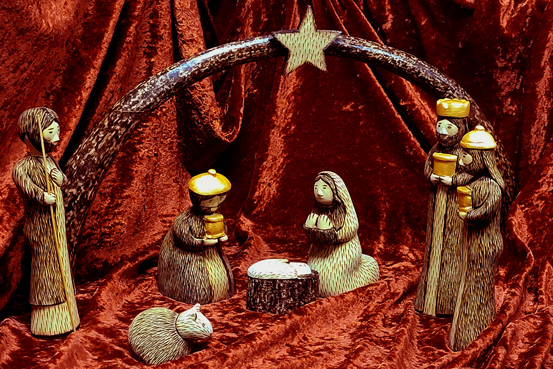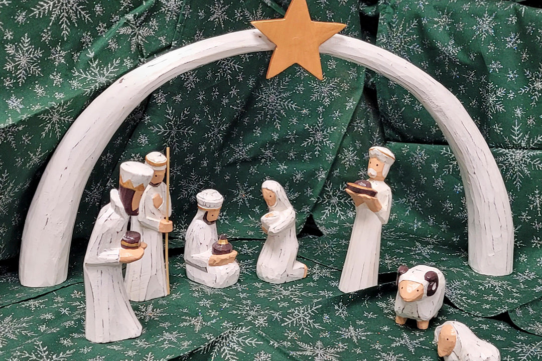 Wooden nativity sets with arch and figurines.