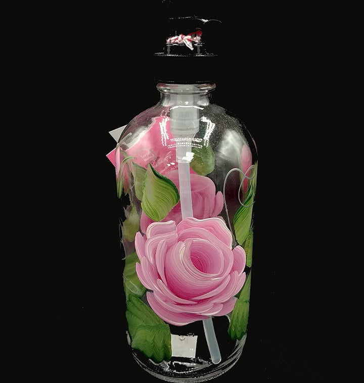 Hand Painted Soap Dispenser Pink Roses. 7" tall, 2.75" diameter. With black lid & hand pump.